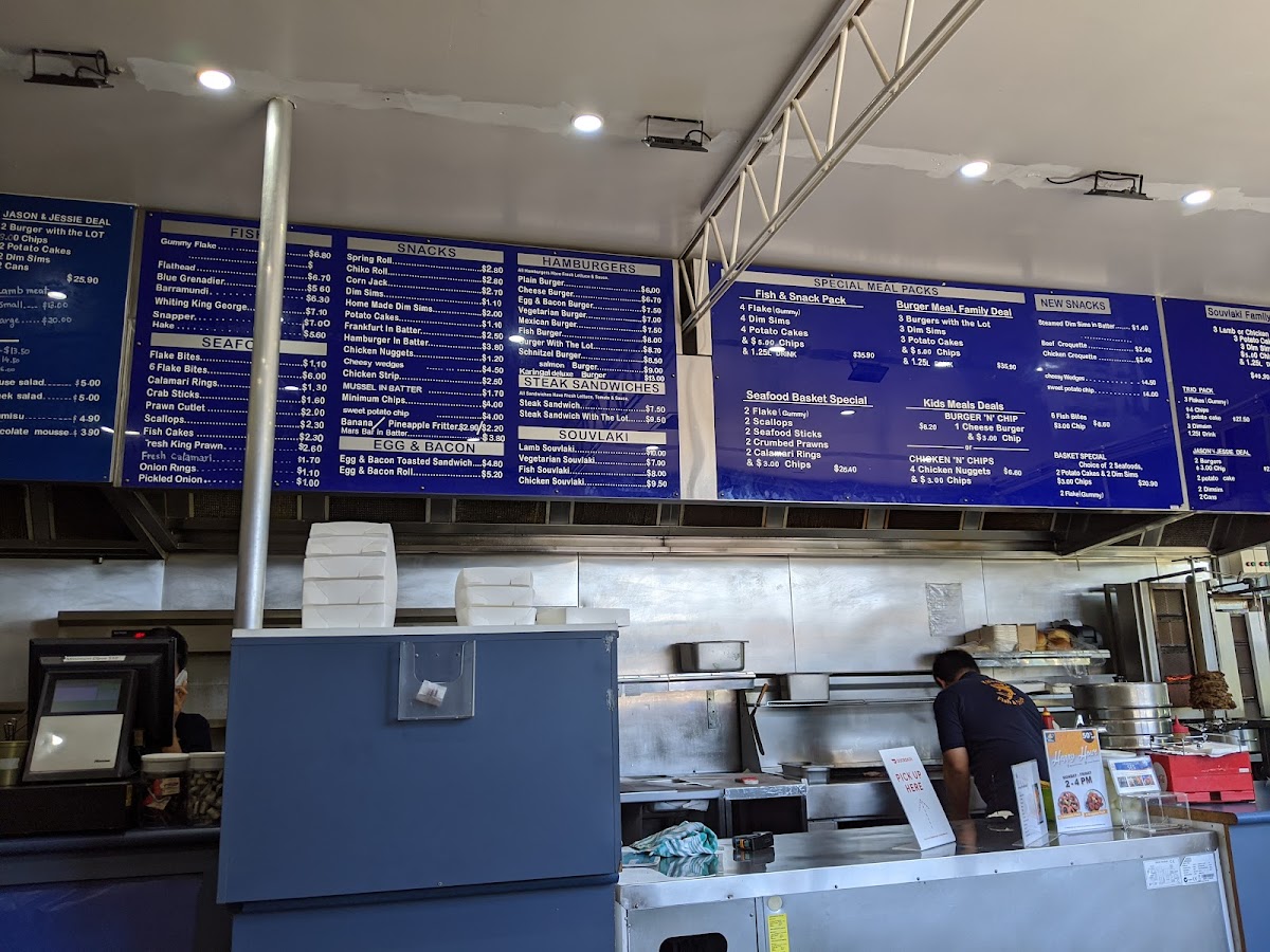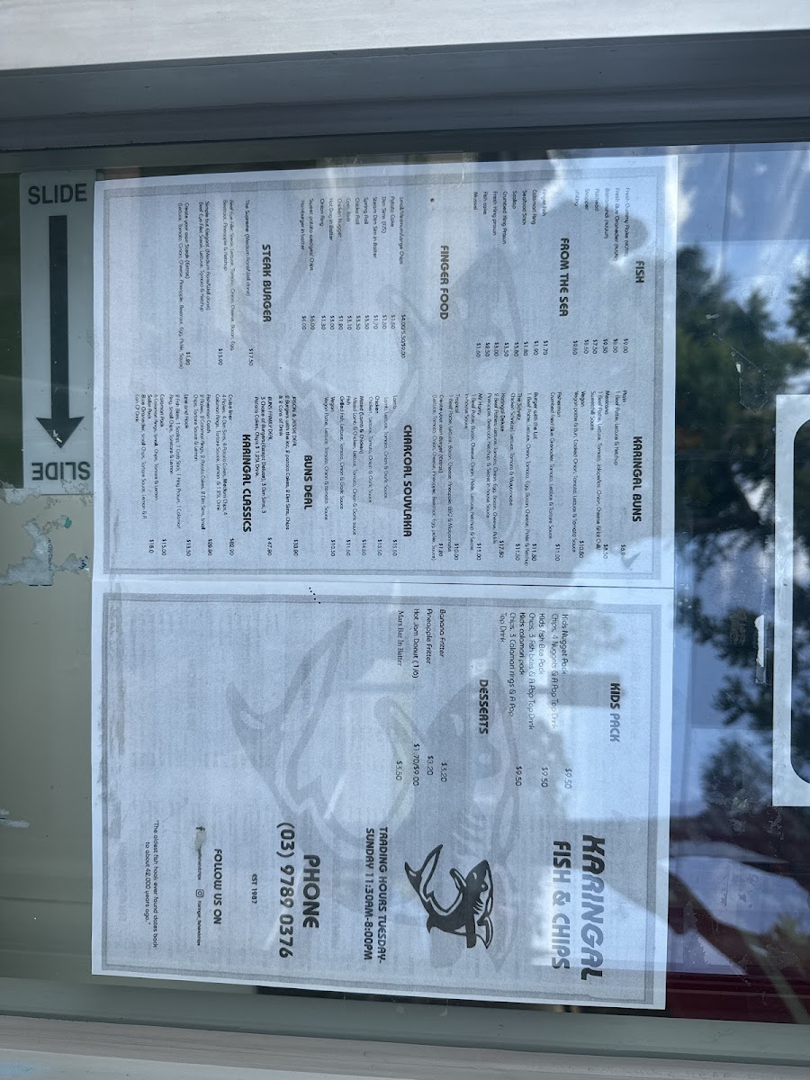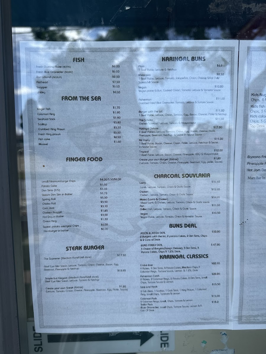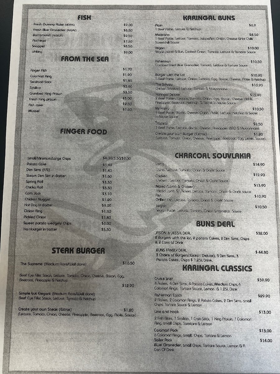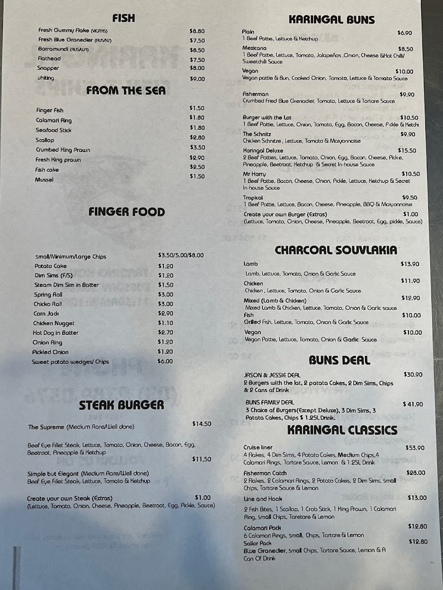 The menu at Karingal Fish and Chip features a selection of fast food options primarily focused on fish and chips, alongside a variety of burger choices. The offerings are designed to cater to casual dining and quick meals, suitable for lunch, dinner, or snack times.